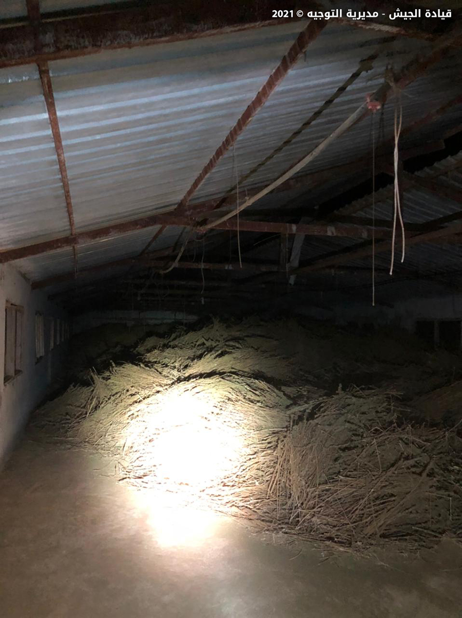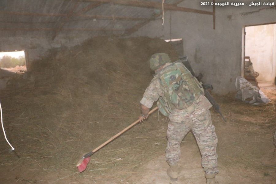دهمت قوة من الجيش بتاريخ 11 / 10 / 2021 تؤازرها مجموعة من مديرية المخابرات في منطقة حوش السيد علي- الهرمل مستودعاً مشبوهاَ، حيث ضبطت حوالى 10 أطنان من حشيشة الكيف وتم تلفها في مكانها.